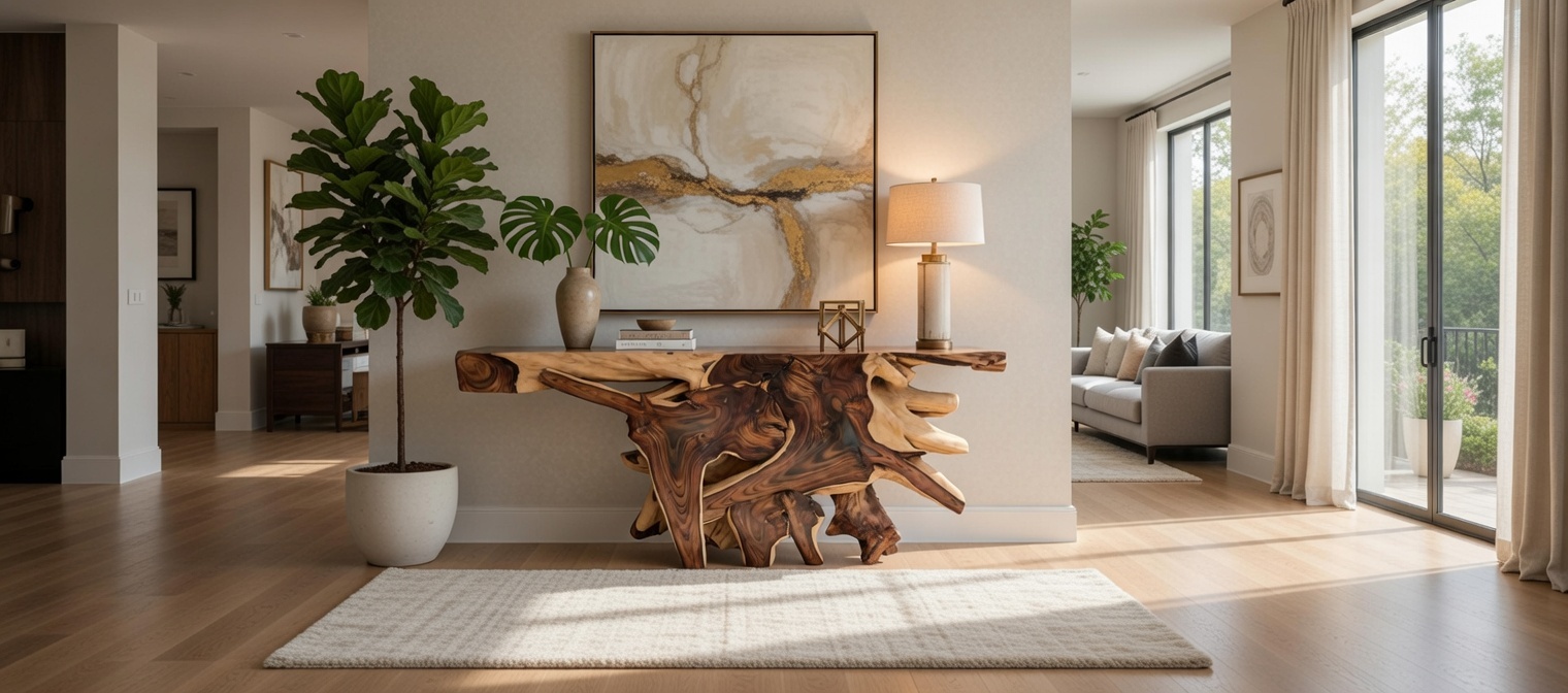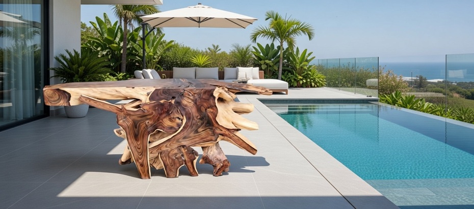 Teakholz - Wunderschöner Teakholz-Wurzelblock. Diese Art von Teakkonsolen bieten wir in vielen verschiedenen Längen und Höhen an! Teakkonsolen eignen sich ganzjährig perfekt für den Outdoorbereich, somit sind es ideale Konsolen für Terrassen oder neben dem Pool.